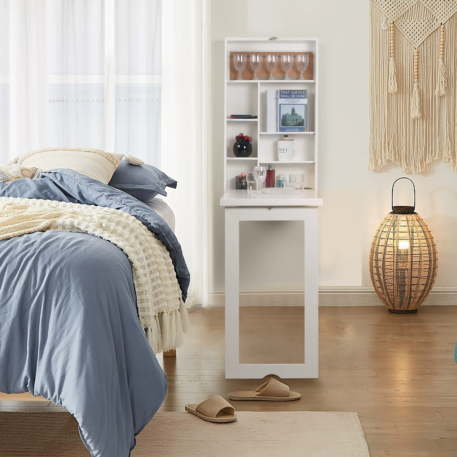 Când nu o mai folosești, blatul se pliază complet pe perete, iar dulapul rămâne elegant și ordonat, păstrând aspectul curat al camerei.