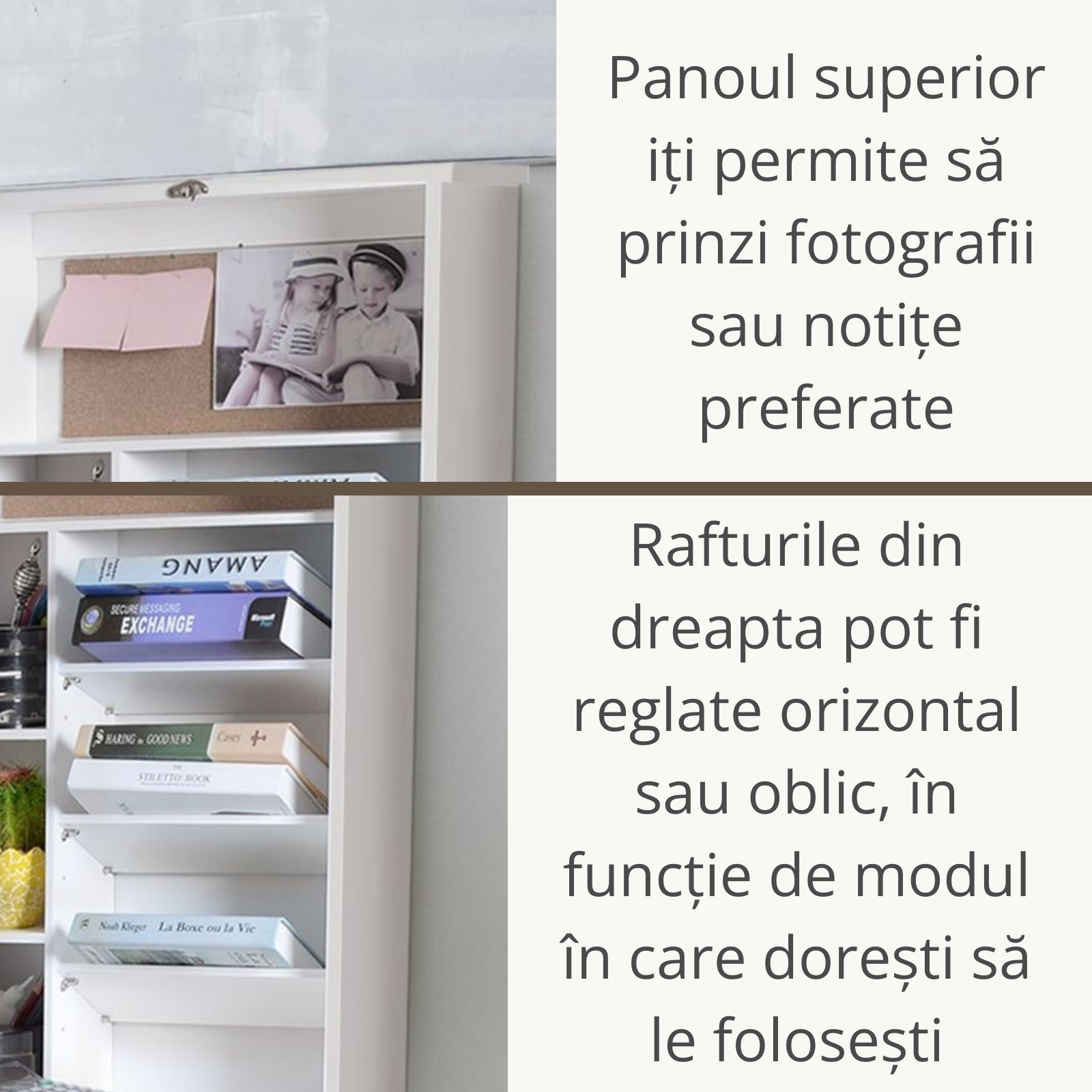 Partea interioară include rafturi reglabile unde poți organiza cărți, pahare, accesorii sau decorațiuni. Rafturile pot fi poziționate drepte sau înclinate, în funcție de obiectele depozitate, iar panoul superior tip plută este ideal pentru a prinde fotografii, notițe sau liste de lucru.