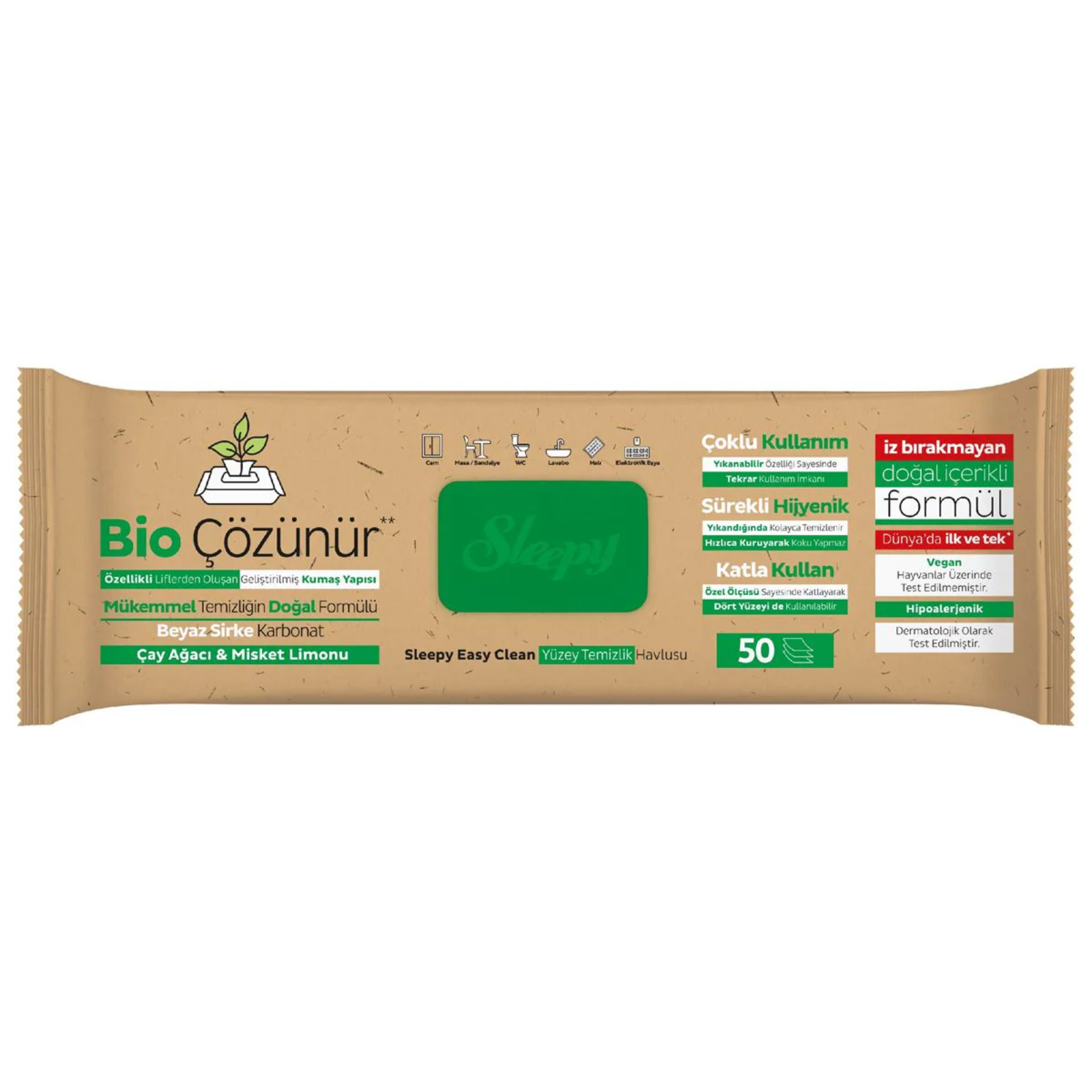 Servetele Umede Biodegradabile Sleepy Bio Easy Clean Tea Tree & Lime 3XLarge, Multisuprafete, Formula cu Otet si Bicarbonat, Antibacteriene, Fara Clatire, 50 bucati