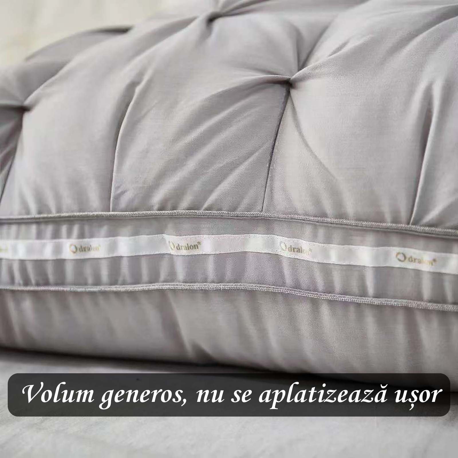 Umplutura din microgel de 1250g imită foarte bine structura fină a pufului natural, oferind volum generos și o senzație plăcută de „afundare”, fără riscul alergiilor. Perna își păstrează forma și revine ușor după utilizare, oferindu-ți mereu același nivel de confort.
