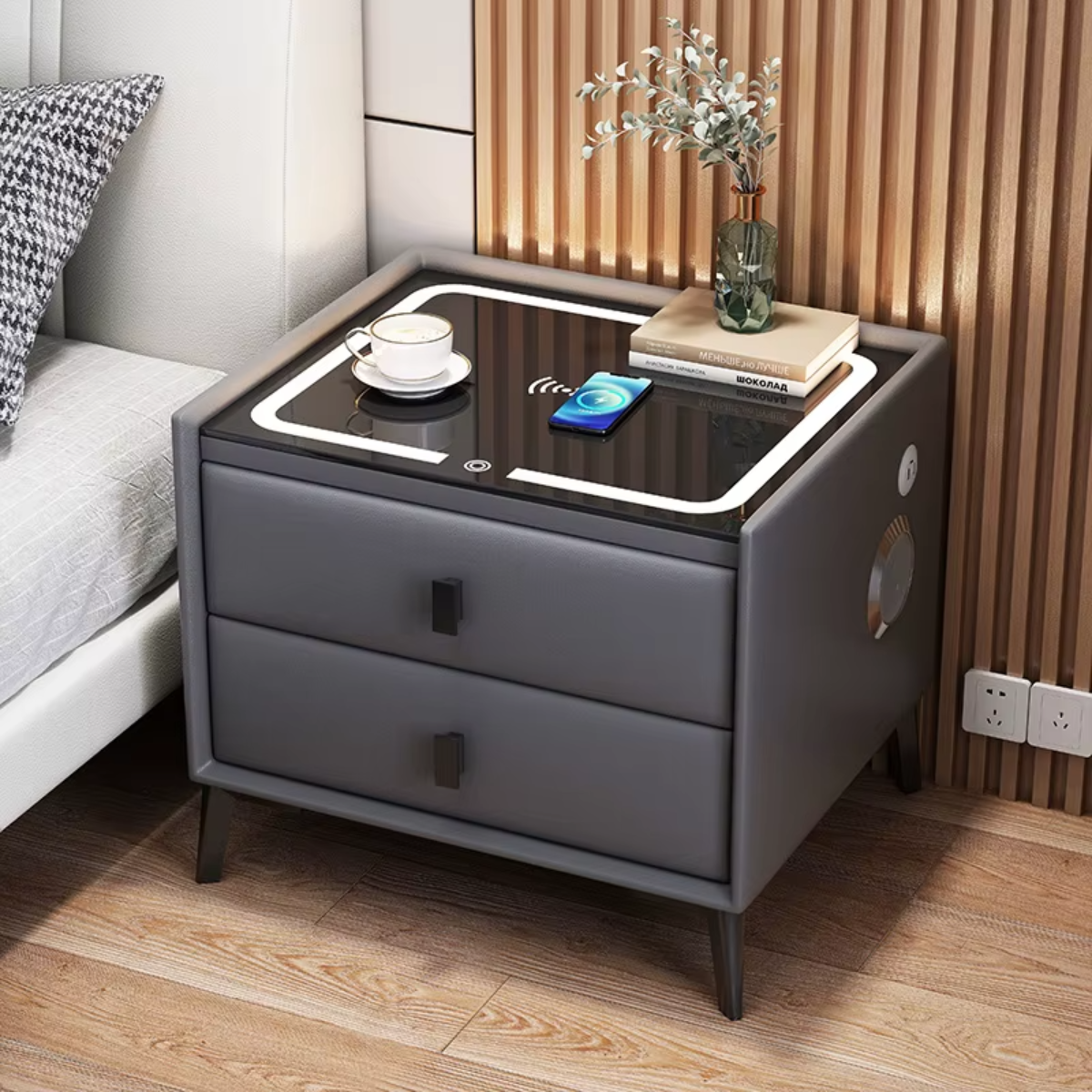 Noptieră Inteligentă INNOVIO® cu Încărcare Wireless 15W, LED Tactil si Boxe Bluetooth 5.0, 2 Porturi USB-C SI 2 Porturi USB-A, Sticla Securizata si 2 Sertare din Lemn, Gri