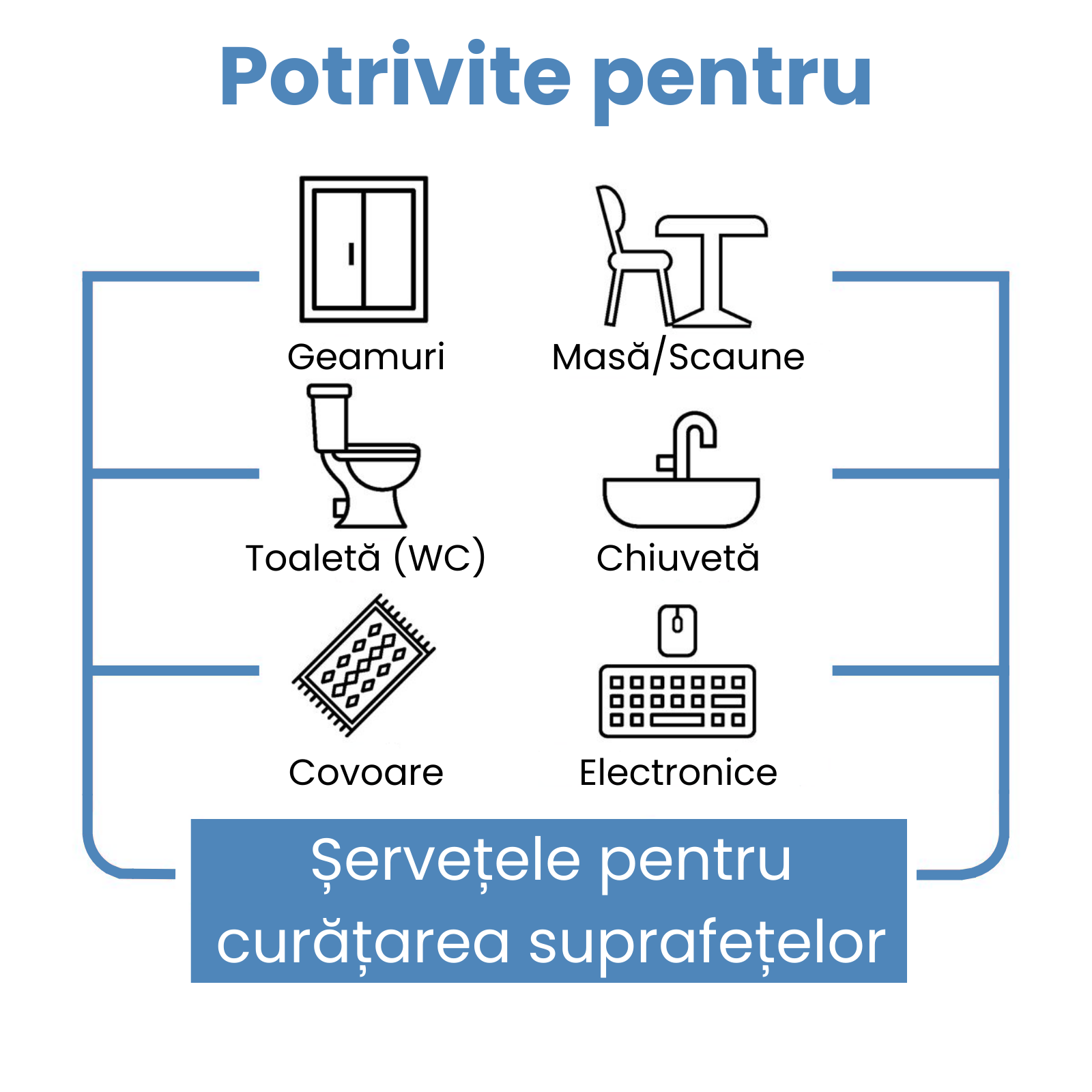 Sunt potrivite pentru majoritatea suprafețelor din casă: bucătărie, baie, sticlă, lemn, ceramică, mese, blaturi, chiuvete, toalete, dar și pentru obiecte precum telefon, tabletă sau telecomandă.