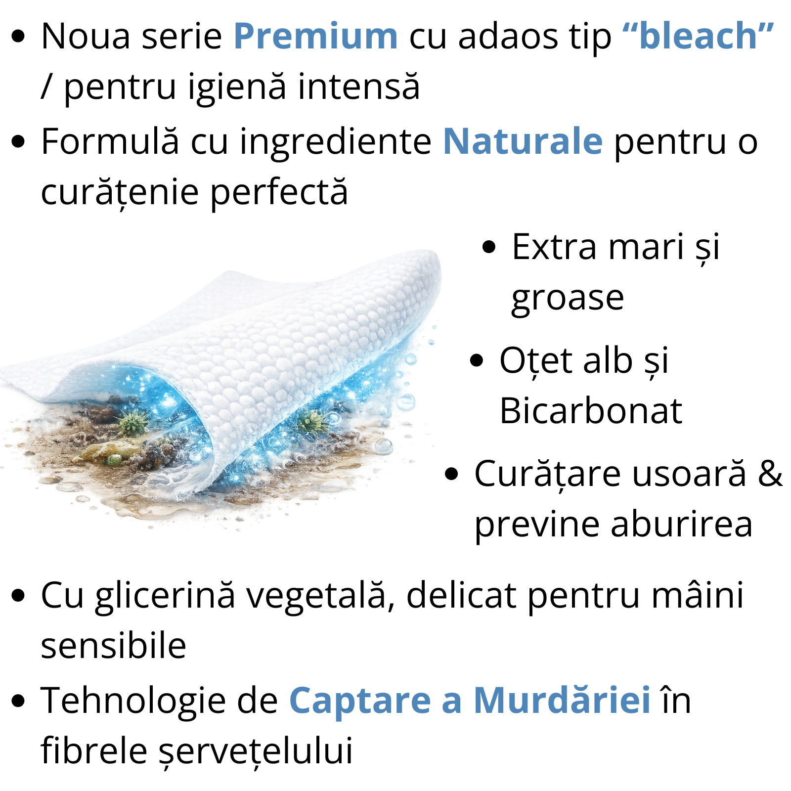 Concepute pentru zonele care necesită o igienă atentă, aceste șervețele oferă curățare eficientă fără clătire și fără efort suplimentar. Textura extra groasă și dimensiunea generoasă permit curățarea rapidă a suprafețelor cu un singur șervețel, economisind timp și energie în rutina zilnică.