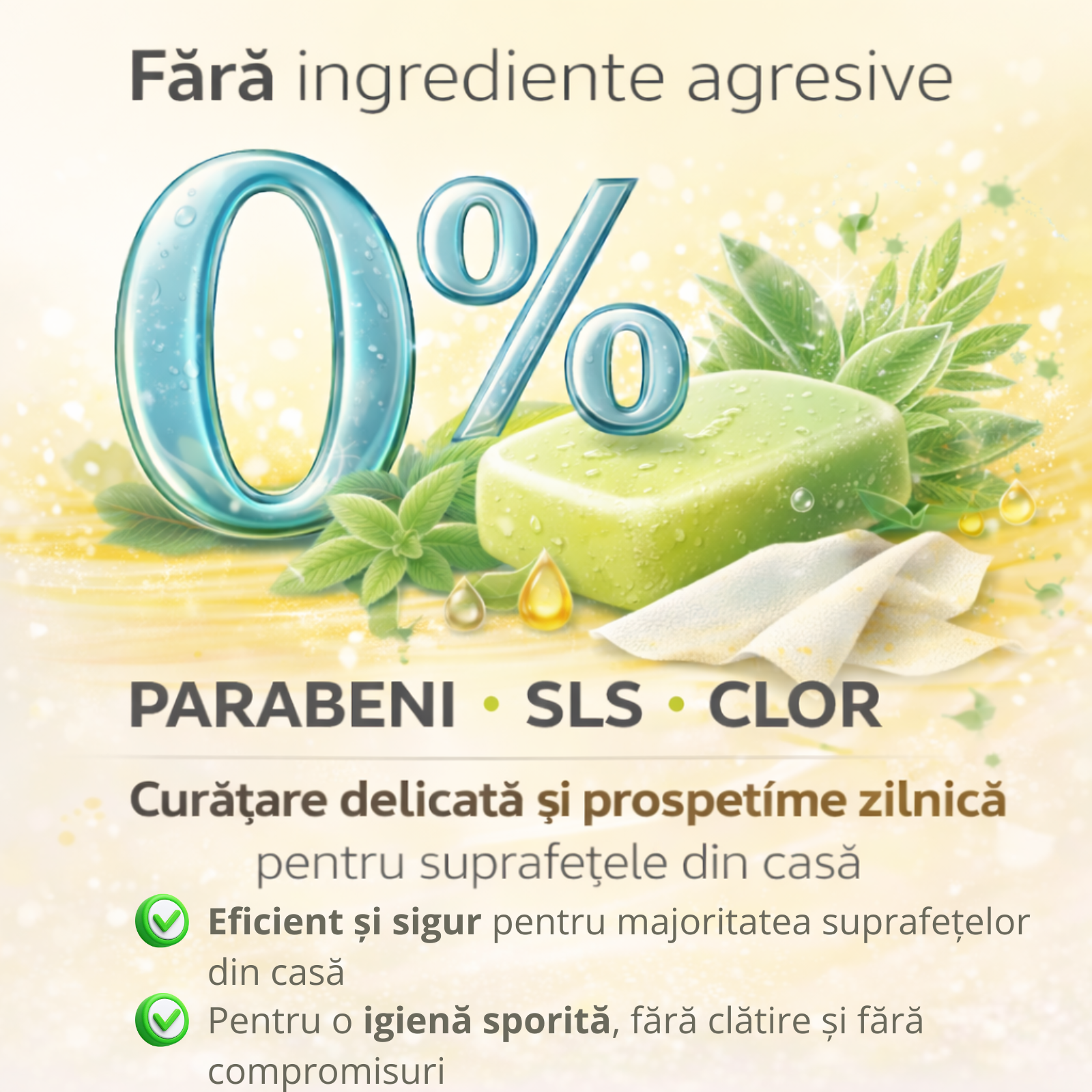 • 0% parabeni, SLS și clor – potrivite pentru utilizarea zilnică în locuință